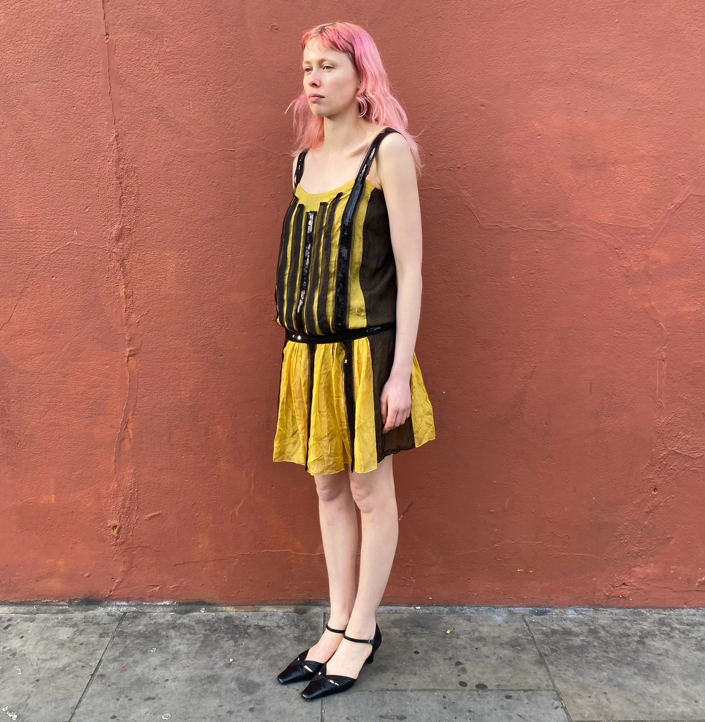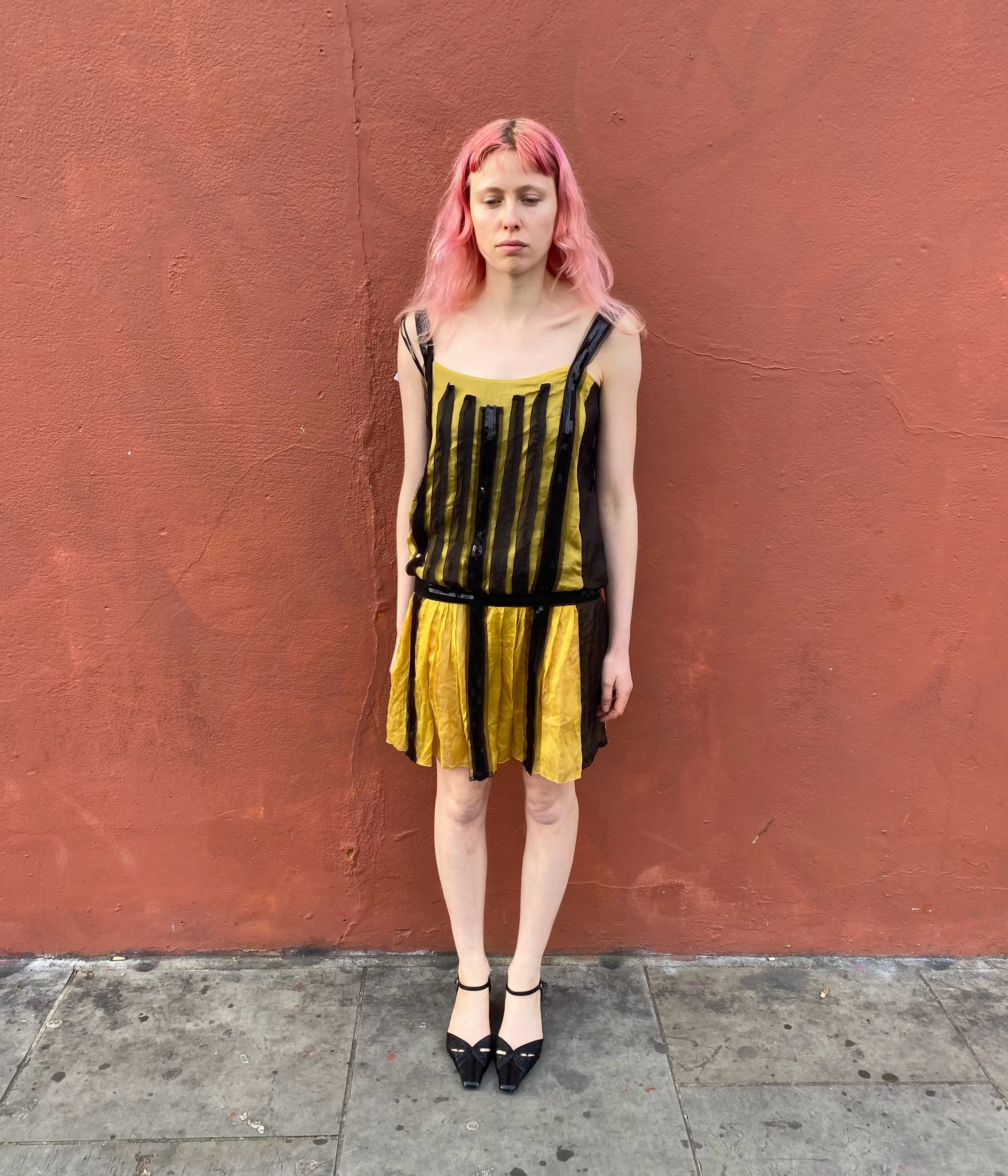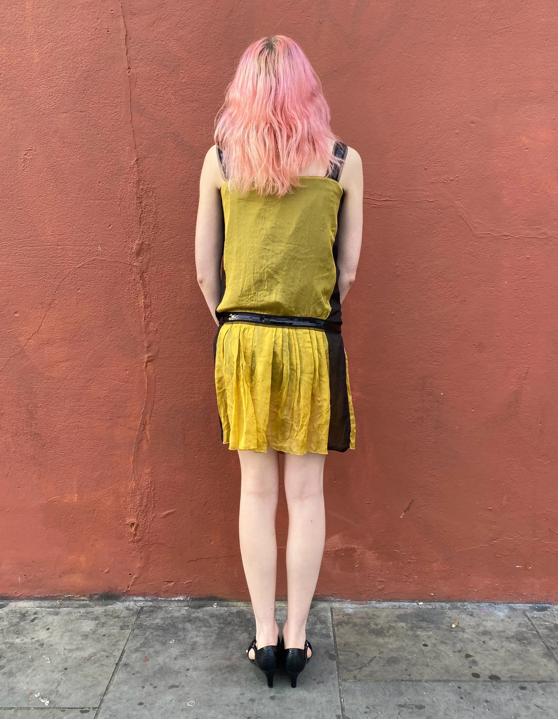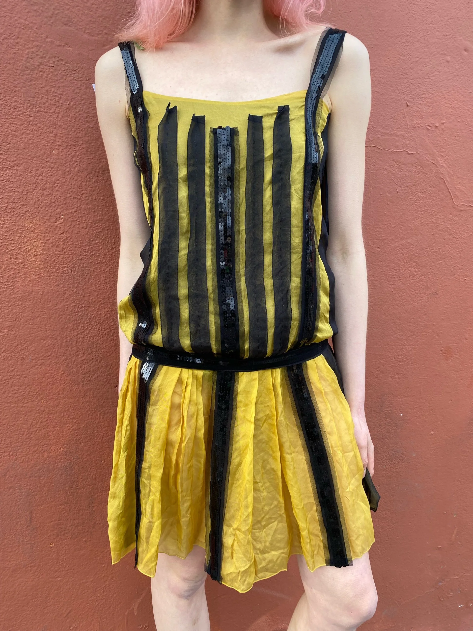 Image 1 of 5 Image 2 of 5 Image 3 of 5 Image 4 of 5 Image 5 of 5 Silk chiffon Philosophy Di Alberta Ferretti drop waist dress £145.00 Silk chiffon yellow and black drop waist dress with black sequin strip detailing at front. Size xs. Add To Cart Added! Silk chiffon yellow and black drop waist dress with black sequin strip detailing at front. Size xs.