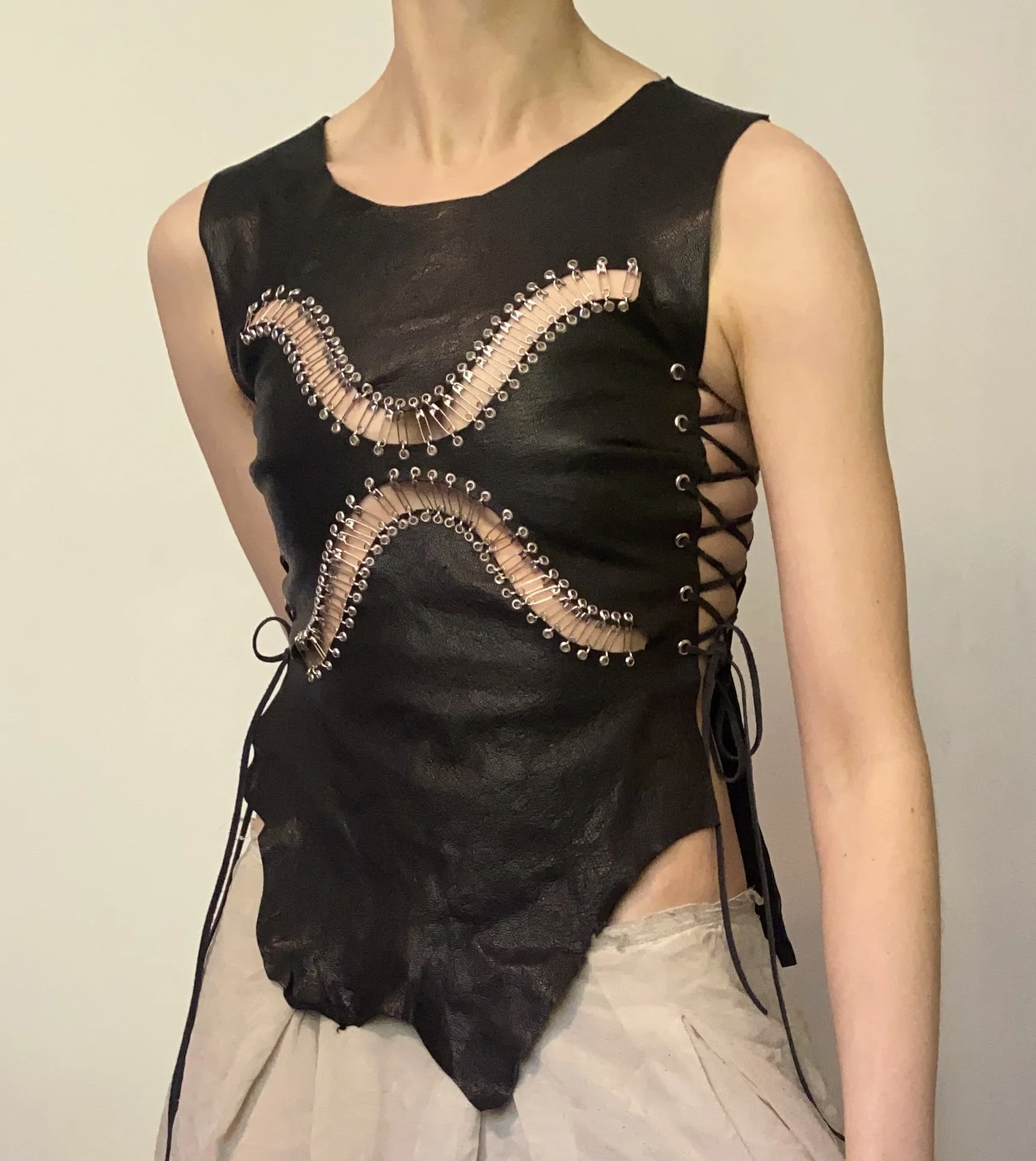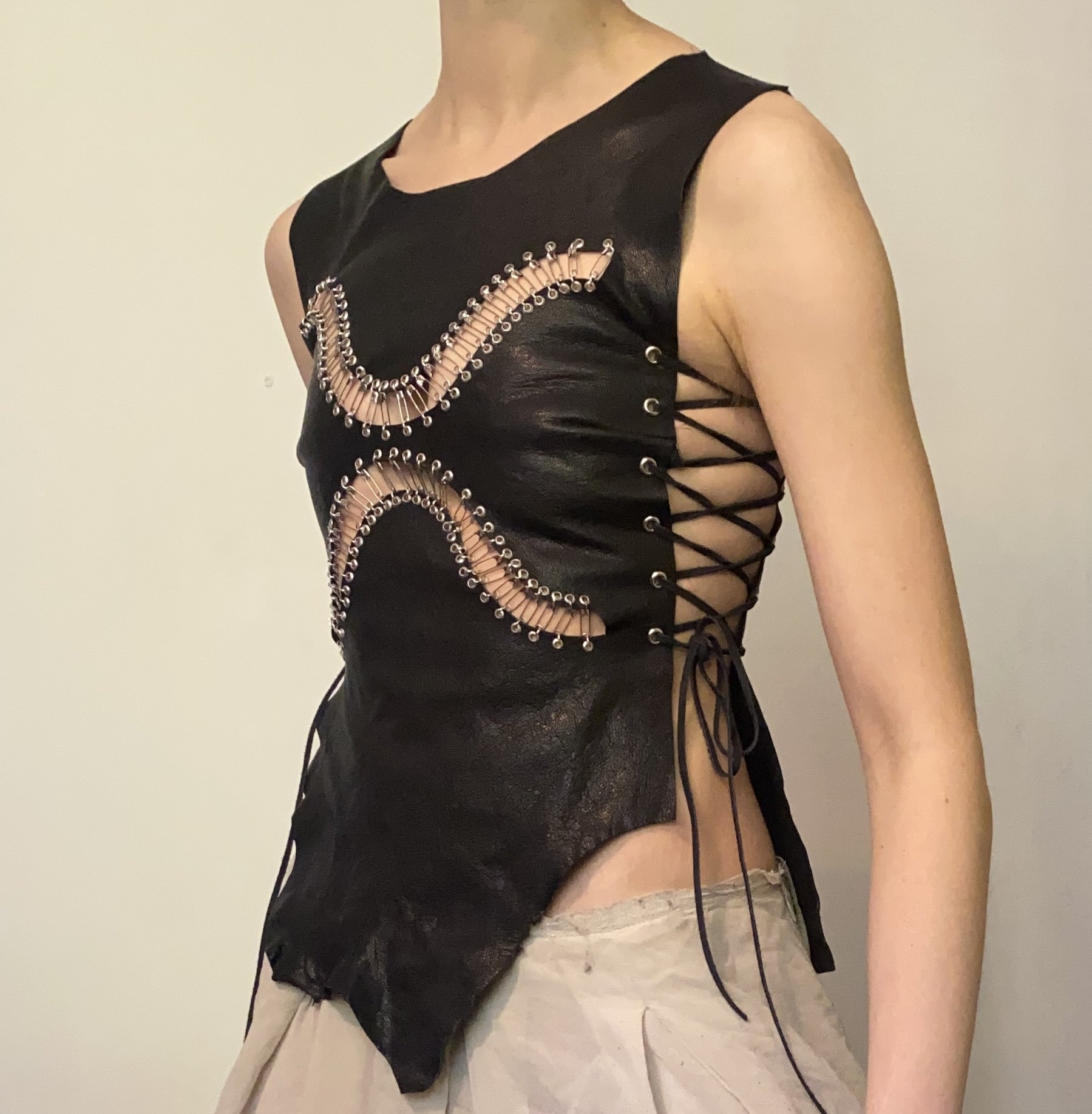 RAW EDGE BREASTPLATE TOP MADE WITH LAMB LEATHER SOURCED FROM THE SURPLACE OF A SHOE MANUFACTURER. Safety pin inserts. ADJUSTABLE SIDES, BEST FIT SIZE 6 - 10. WIPE CLEAN ONLY.