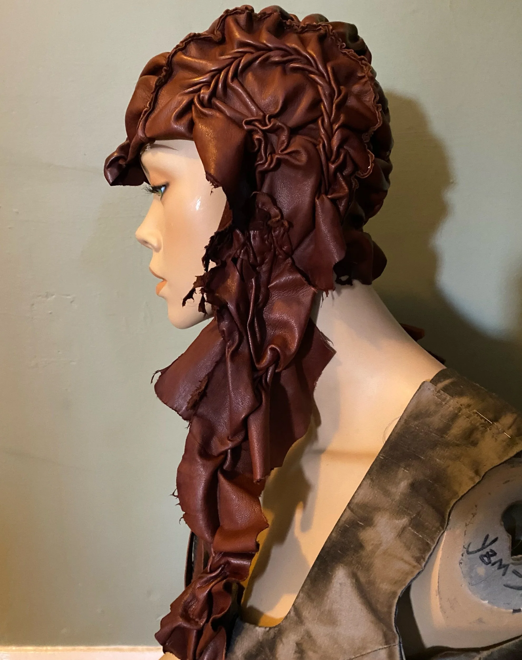 DEADSTOCK LEATHER SMOCKED AND RUCHED BONNET MADE FROM LEATHER SOURCED FROM A SHUT DOWN GLOVE FACTORY. LINED IN DEADSTOCK LINEN. SELF TIE LONG LEATHER STRAPS. WARM LEATHER HAT. DO NOT WASH.