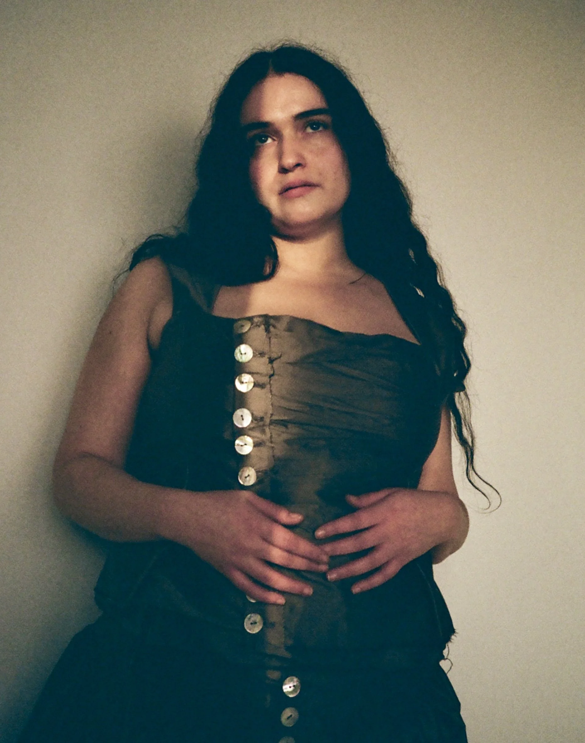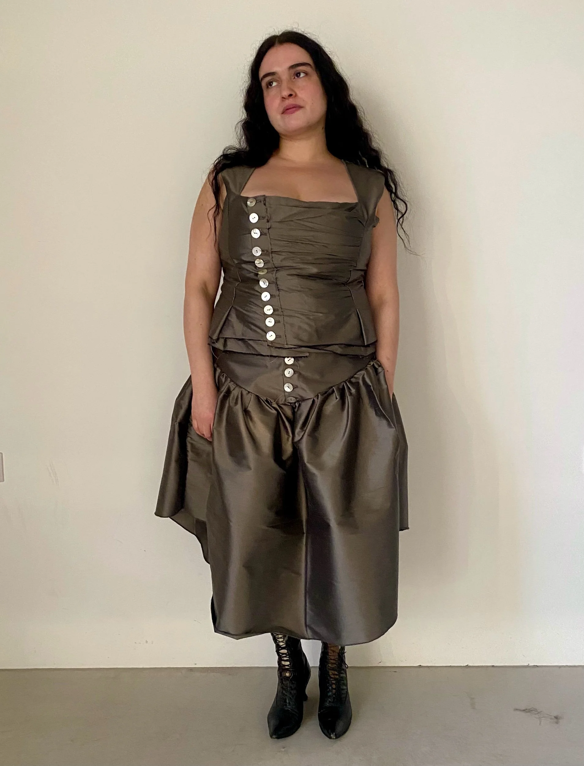 DEADSTOCK SILK DUPION RUCHED TOP WITH MOTHER OF PEARL BUTTONS. FULLY LINED in Deadstock cotton, THE TOP IS CUT FOR A CLOSE FIT AND FINISHED WITH A RAW HEM. DRY CLEAN ONLY. ORDERS WILL BE COMPLETED 2 - 4 WEEKS FROM PAYMENT DATE.